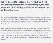 英超球队也开始降薪!阿森纳球员教练自愿降薪